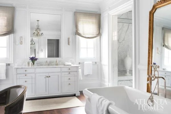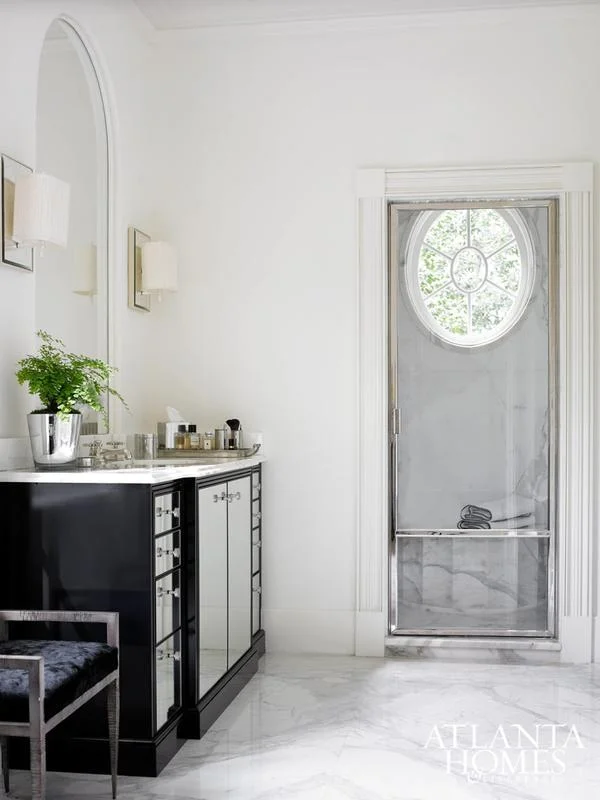Part of an exquisite remodel of best-selling author Emily Giffin and husband Buddy Blaha’s iconic 1920s Philip Trammell Shutze–designed home, this bath is a fresh take on timeless style, thanks to architect D. Stanley Dixon and interior designer Beth Webb. “We wanted to bring some of the glamour back into the house,” says Dixon. Previous renovations featuring stained wood and other heavy elements left the bath feeling dark, so the space was gutted to make way for a fresh, Regency-inspired aesthetic that reflects the couple’s youthful style.